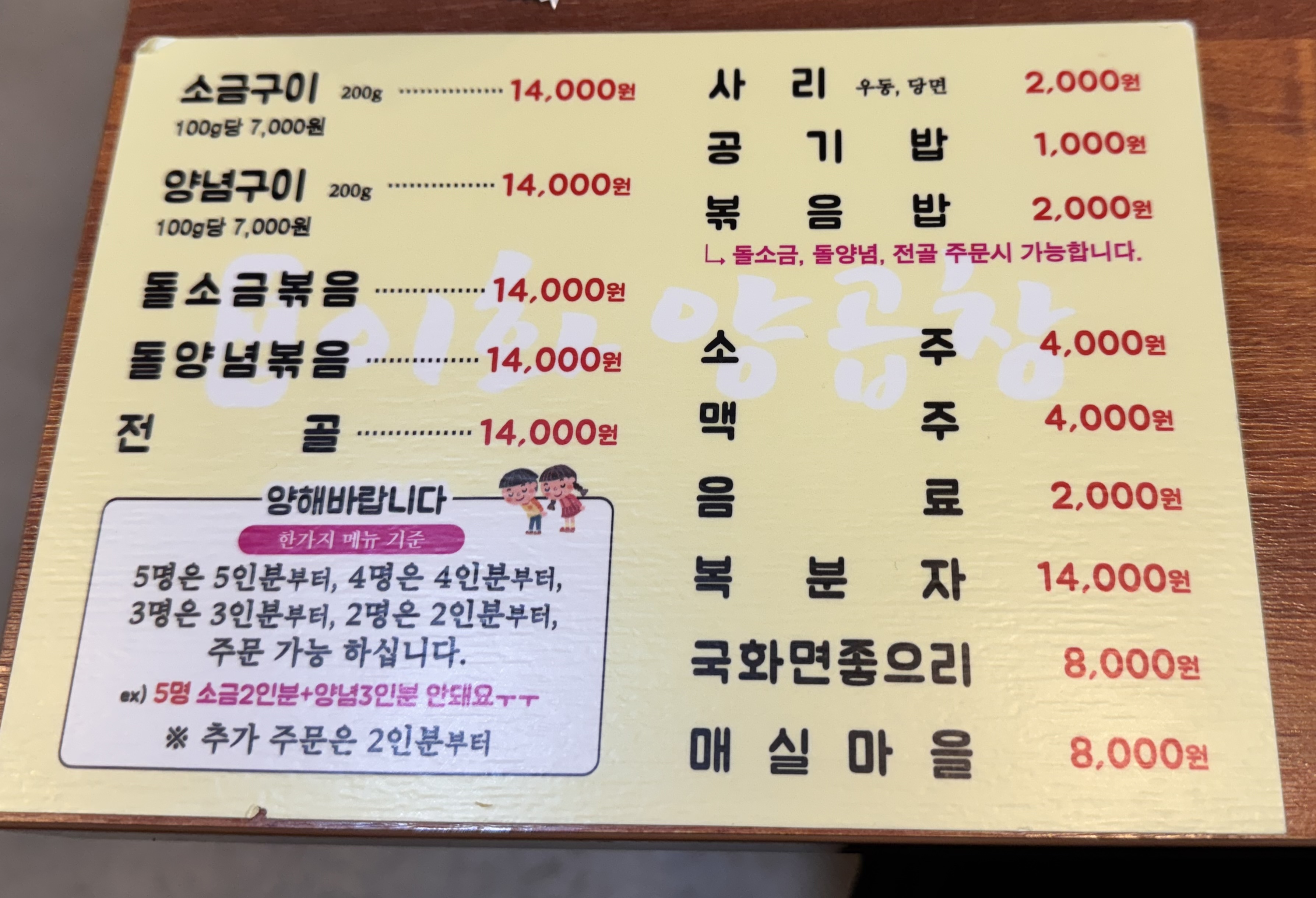 이화양곱창의 특징은 가격이 저렴하다는 것. 그리고 2명이 와도 2인분부터 주문 가능하다는 것입니다. 경상도에서는 기본 3인분부터 주문 가능한 곳이 대부분인데 말이죠.