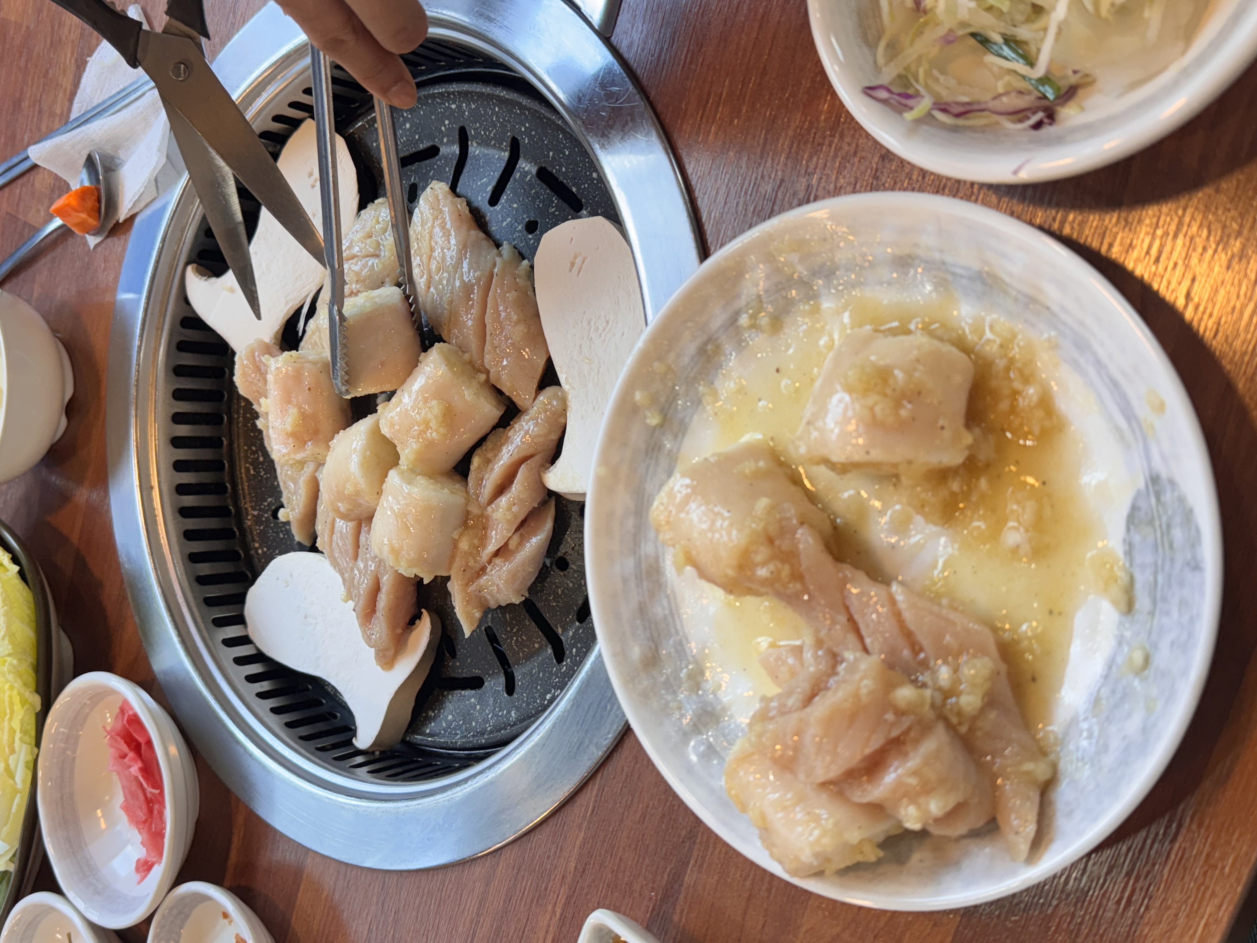 마늘 등의 양념이 있기 때문에 자주 뒤집어주어야 합니다. 안 그러면 금방 타버리는데, 탄 마늘도 나름의 매력이 있습니다.