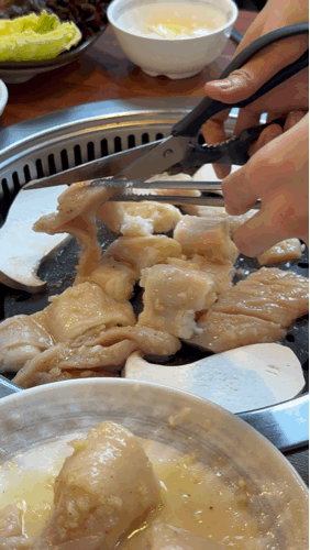 대창은 반으로 갈라 기름 쪽을 불판에 구워주고, 특양은 한 입 크기로 다 잘라줍니다.